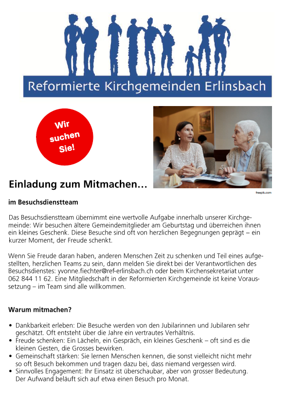 Haben Sie Freude an fremden Kulturen? Zur Ergänzung des Teams suchen wir am Mittwochvormittag freiwillige Unterstützung für den Deutschunterricht unserer Migrantinnen. Bitte melden Sie sich bei Laura Cardozo, laura.cardozo@ref-erlinsbach.ch